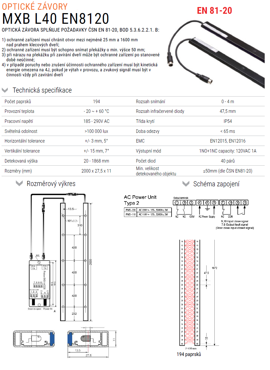 | Optická závora MXB L40, 194 paprsků, vč. řídící jednotky 230 VAC dle ČSN EN 81 – 20 | 4 463 Kč |